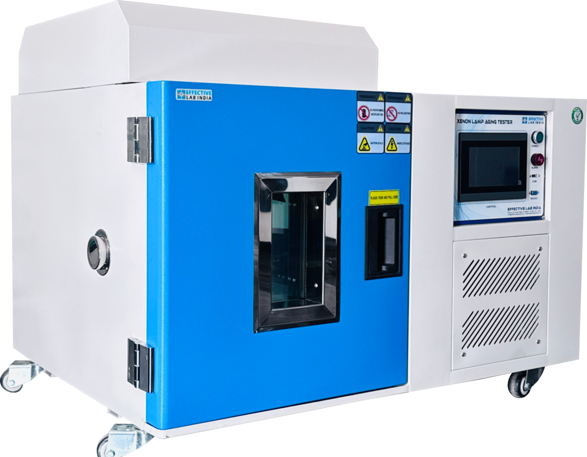 A xenon lamp aging tester (also called a xenon arc weathering tester or xenon weathering chamber) is a laboratory test instrument used to simulate outdoor weather (sunlight, heat, humidity, rain). Effective Lab India offers high quality of xenon arc lamps which allowing manufacturers to test how products degrade under prolonged exposure to light, heat, humidity and weather. It is commonly used in various used in various industries like automotive, textile, paint, plastic, etc. where it tests the product’s lifespan.